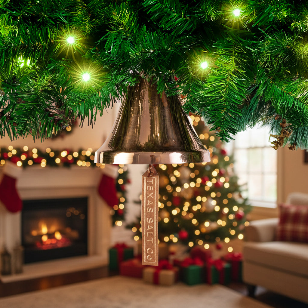 Handcrafted from pure copper, this striking bell delivers a distinctive, resonant tone that's uniquely its own. Each piece bears the Texas Salt Co logo on a dangling accent, making it a conversation starter for your kitchen, porch, or collection. With only a limited number available, this artisanal bell combines rustic charm with genuine craftsmanship—a one-of-a-kind addition that won't last long.