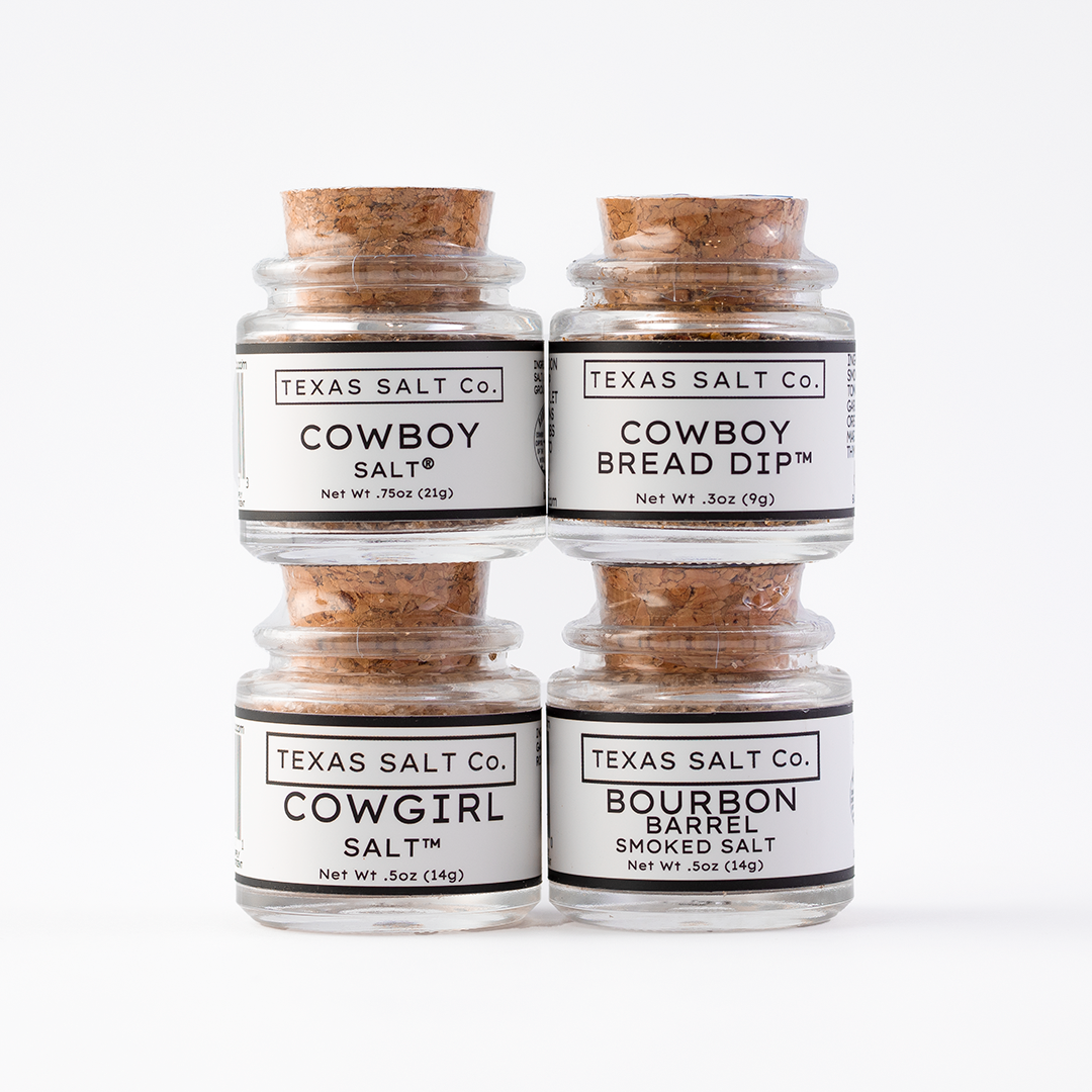 Yeehaw! Get the best of the wild west with our Best Seller 4-pack. Savor our Smoked Cowboy Salt and unsmoked Cowgirl Salt on steak and red meat, or try our Bourbon barrel smoked salt on chicken and veggies for a lighter, sweeter touch. Don't forget our famous bread dip - it's a hoedown in every bite!
